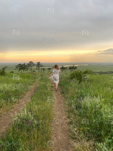 Вид сзади на женщину в романтическом платье, бегущую по полю зеленой травы на закате в летнее время