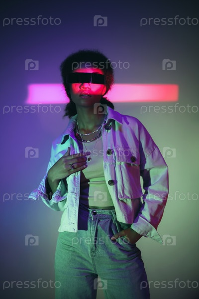 Молодая самоуверенная афроамериканка в гарнитуре VR, играющая в игры виртуальной реальности