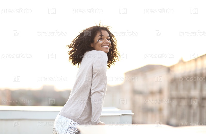 Молодая счастливая африканская американка с блестками на лице наслаждается видом на закатный город на крыше