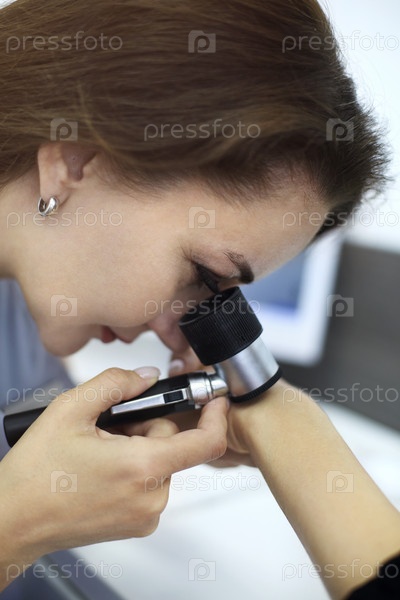 Фотография крупным планом женщины-дерматолога, осматривающей невус или родимые пятна на руке пациента с помощью дерматоскопа