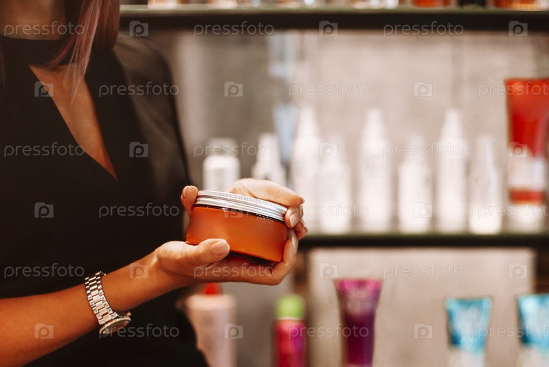 Женщина-парикмахер держит банку с маской для волос во время работы в салоне красоты