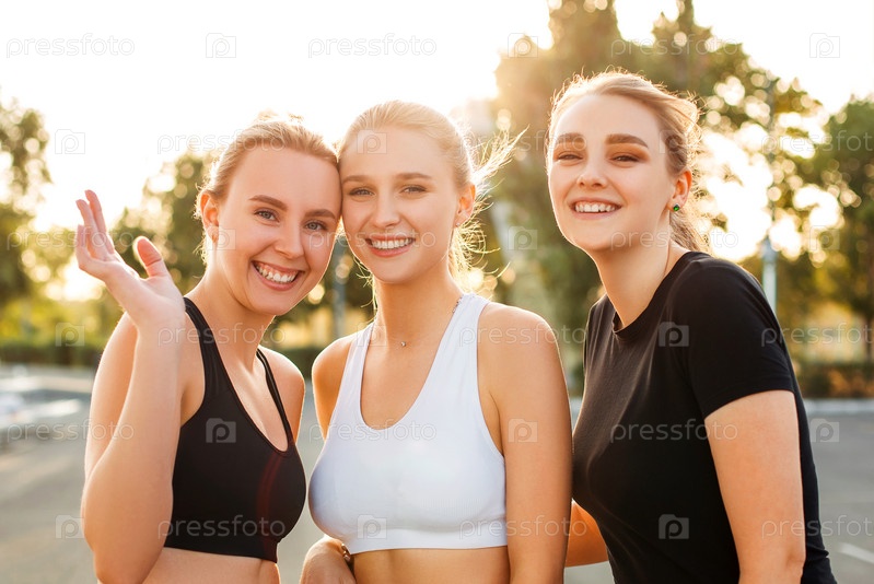 Молодая спортсменка со свежим напитком стоит рядом с друзьями
