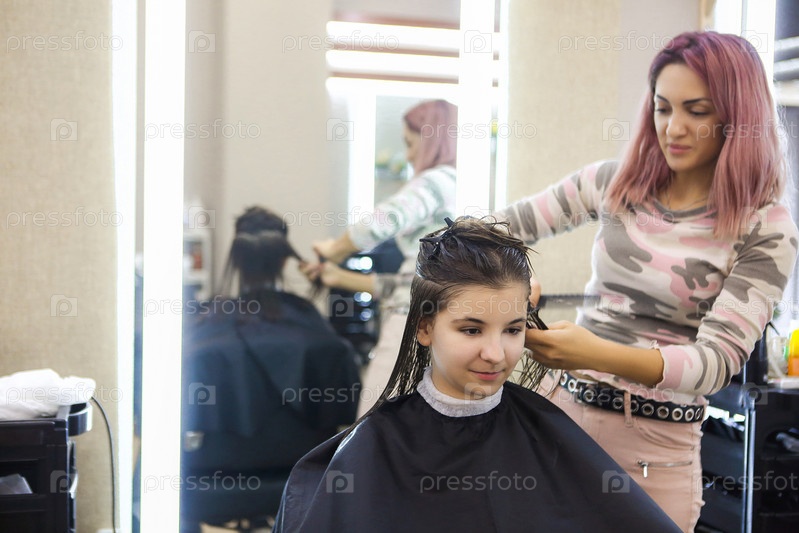 Женщина-парикмахер стрижет волосы жизнерадостной женщины
