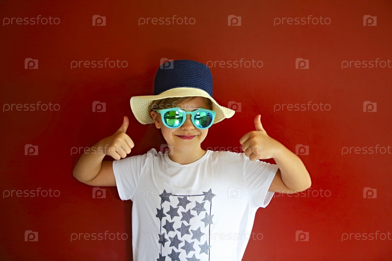Довольно эмоциональный ребенок носит шляпу и солнцезащитные очки на красном фоне