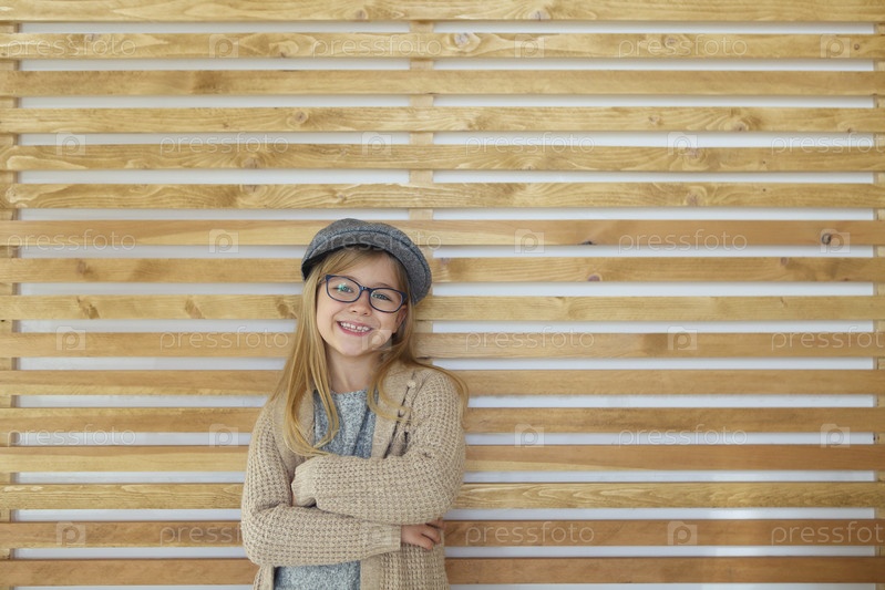 Улыбающаяся милая маленькая девочка в черных очках в кепке на деревянном фоне