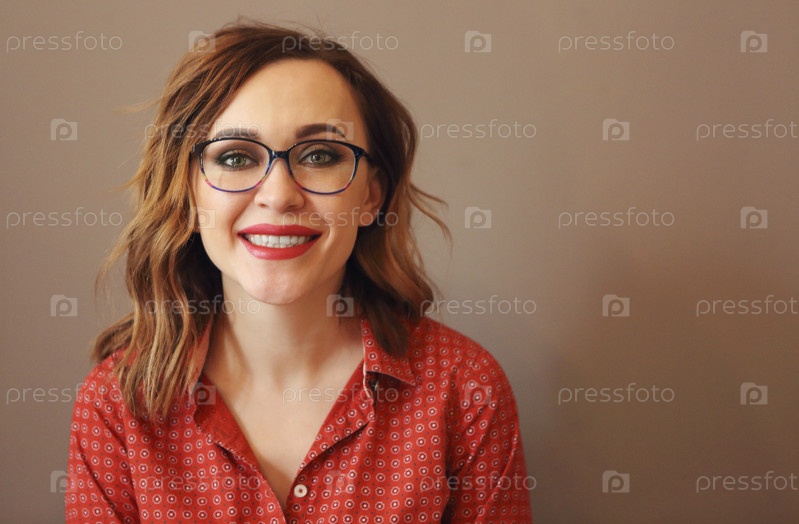 Портрет привлекательной брюнетки в очках в красной блузке