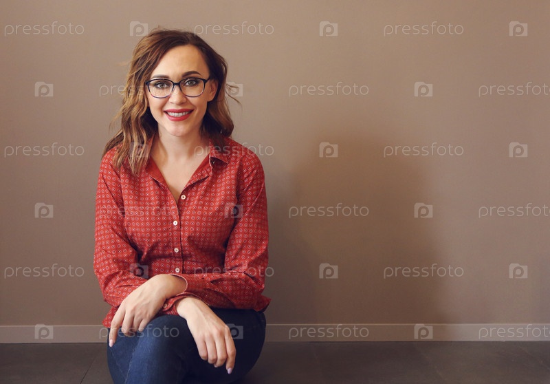 Портрет привлекательной брюнетки в очках в красной блузке