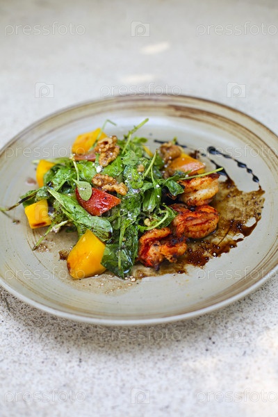 Вкусный салат из морепродуктов с овощами и креветками на столе