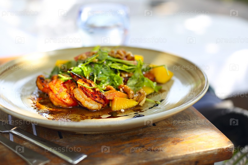 Салат из морепродуктов с овощами и креветками на деревянном столе