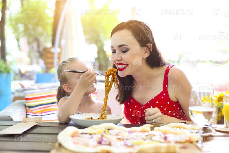 Счастливая мать и дочь едят спагетти болоньезе в ресторане