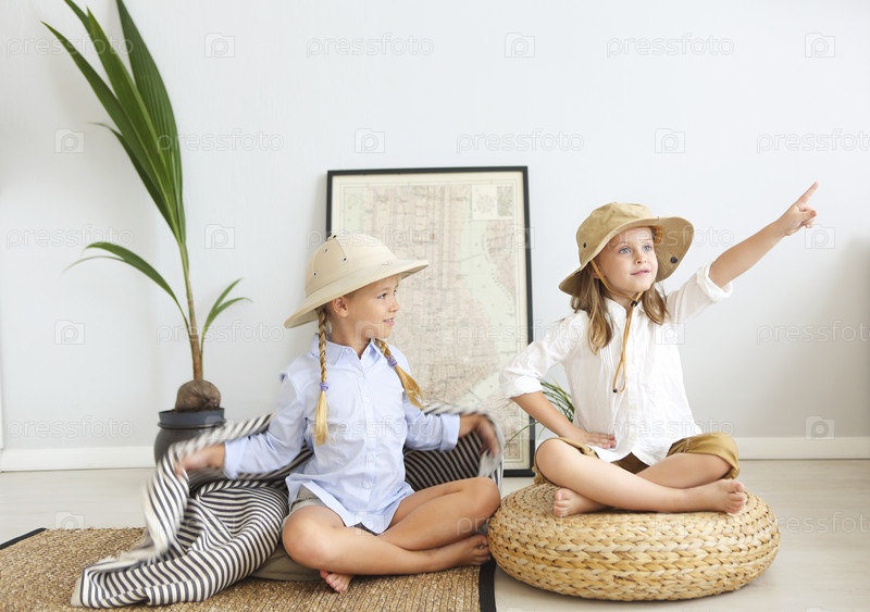 Две маленькие девочки играют дома с путешественниками в винтажной одежде