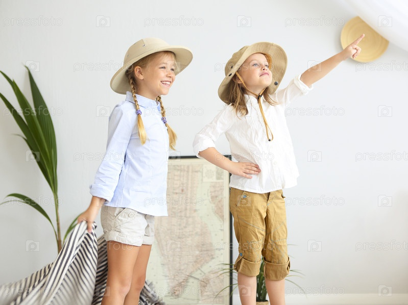 Две маленькие девочки играют дома с путешественниками в винтажной одежде