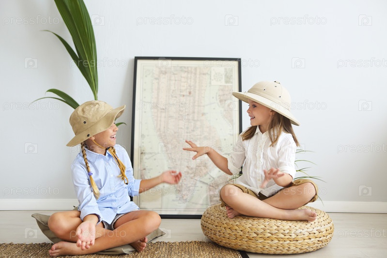 Две маленькие девочки играют дома с путешественниками в винтажной одежде