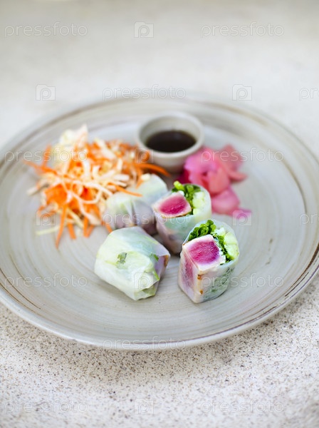 Роллы с обжаренным тунцом с зеленым салатом на белой тарелке