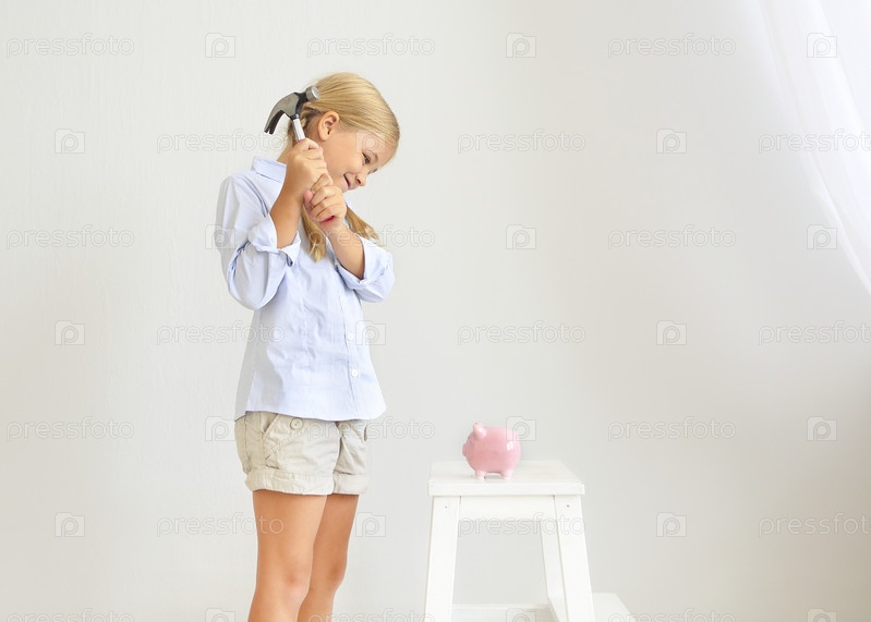 Маленькая девочка с молотком у розовой свиньи-копилки