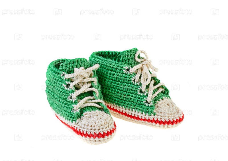 Зеленые пинетки с красной линией, вязанные крючком, изолированные на белом фоне