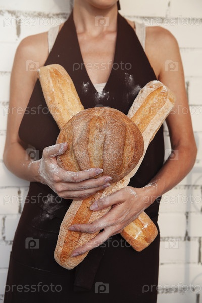 Женщина держит буханки свежего хлеба
