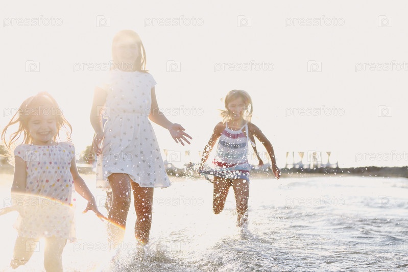 Счастливые дети бегают по морской воде