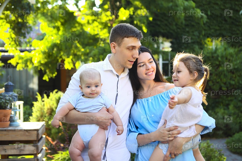 Счастливая семья с маленькими детьми в зеленом дворе