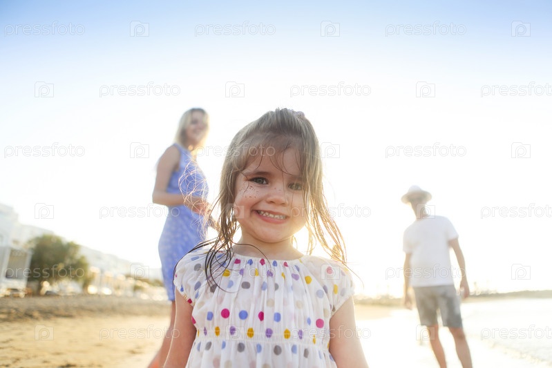 Счастливая семья бежит по морской воде