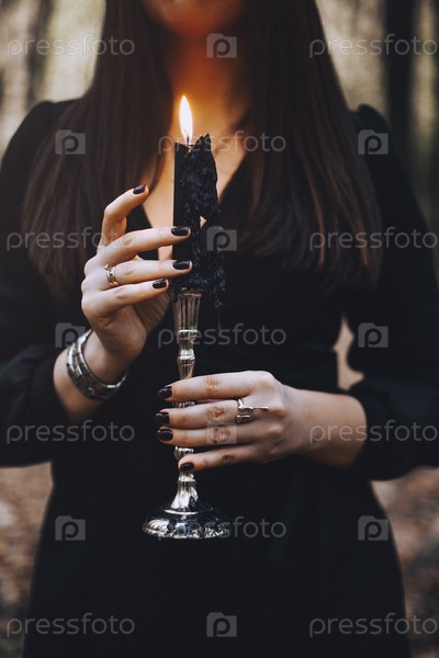 Таинственная женщина со свечой в руках, совершающая магический ритуал в темном осеннем лесу