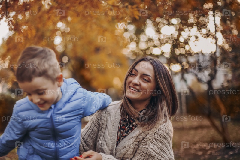 Молодая счастливая семья, любящая мать и маленький сын, гуляющие на свежем воздухе в осенний день