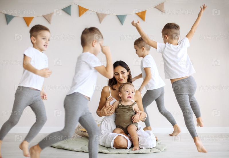 Большая семья матери и пятерых детей, играющих вместе дома