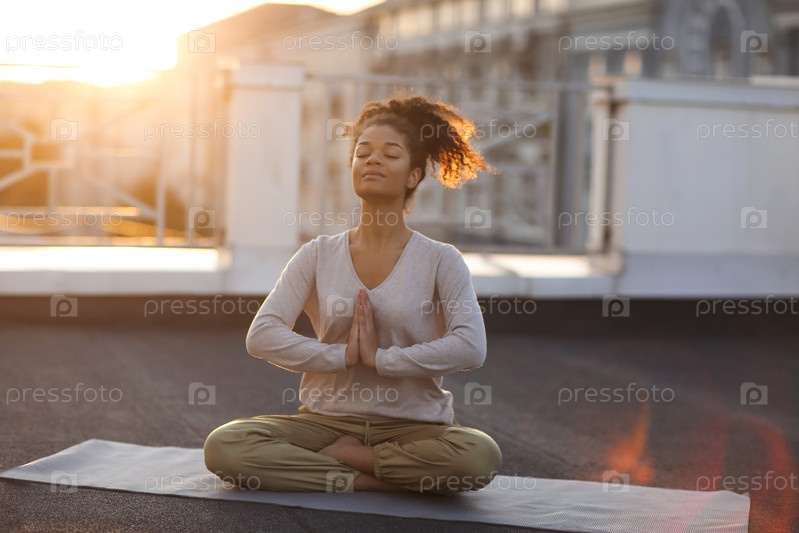 Женщина сидит в позе лотоса на коврике и занимается йогой, женщина медитирует в помещении