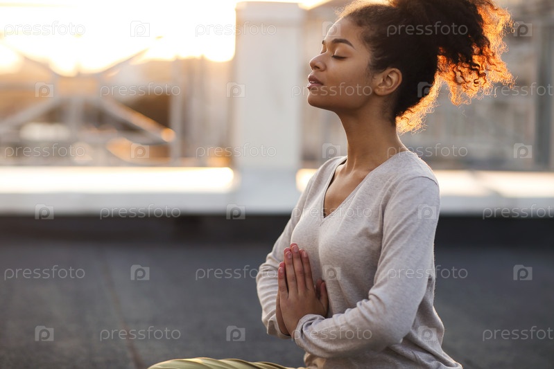Женщина сидит в позе лотоса на коврике и занимается йогой, женщина медитирует в помещении