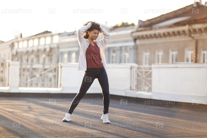 Молодая беззаботная африканская американка в полный рост прыгает на крыше под утренним солнечным светом