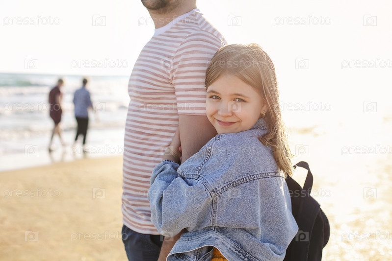 Любящий отец обнимает свою очаровательную маленькую дочь на пляже, папа и ребенок вместе проводят время на свежем воздухе