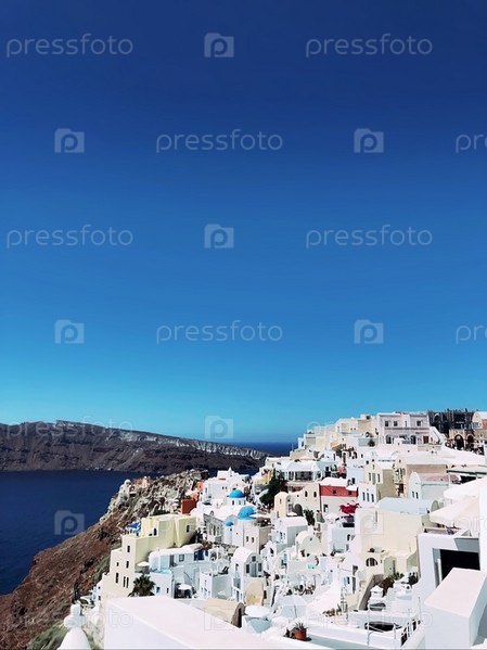 Удивительный панорамный вид на красивый город Ия на вулканическом острове Санторини, Греция