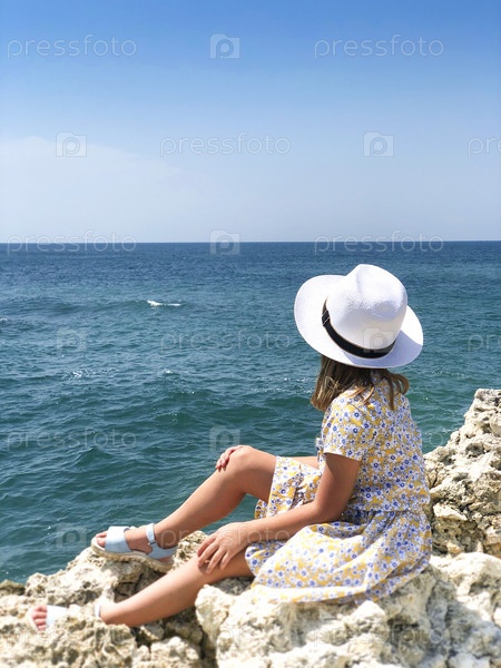 Маленькая девочка сидит на скалистом берегу и смотрит на море во время летних каникул с семьей на берегу моря