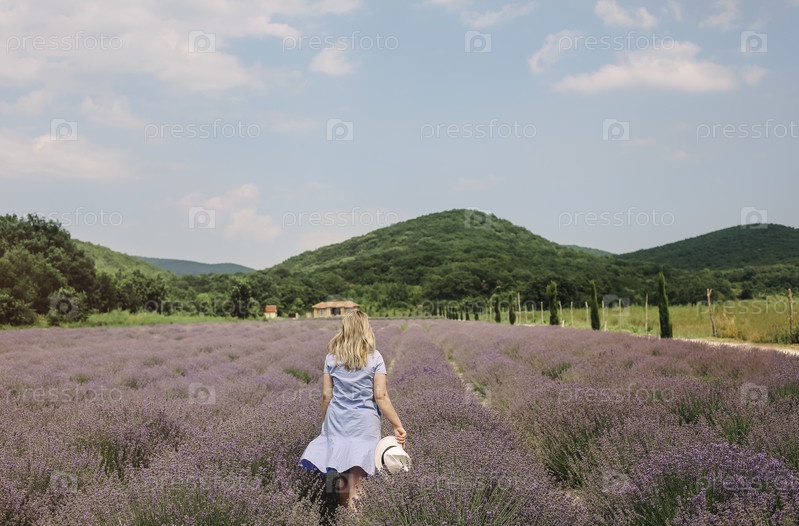 Вид сзади на женщину в платье и белой шляпе посреди лавандового поля