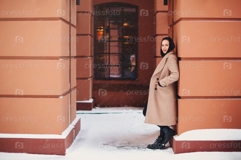 Молодая красивая девушка в бежевом пальто и кожаных сапогах одиноко стоит на улице в снежную зимнюю погоду