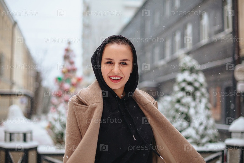Молодая позитивная женщина со смешной улыбкой на лице стоит снаружи на фоне зимнего города