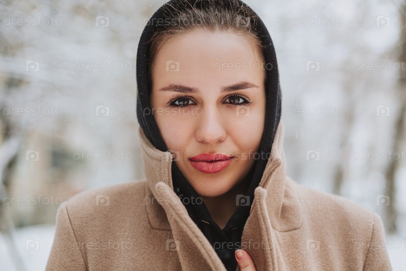 Молодая позитивная женщина со смешной улыбкой на лице стоит снаружи на фоне зимнего леса