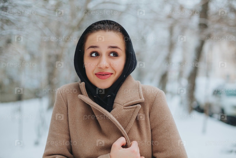 Молодая позитивная женщина со смешной улыбкой на лице стоит снаружи на фоне зимнего леса