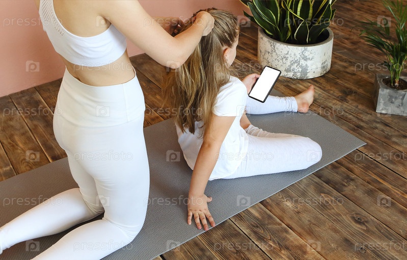 Девушка со смартфоном в руке заплетает длинные волосы перед спортивной тренировкой в фитнес-студии