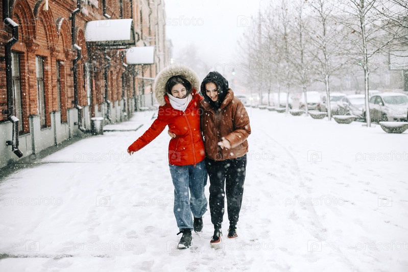 Две счастливые подруги наслаждаются снежной погодой на улице, лучшие подруги в зимней одежде пуховиках смеются