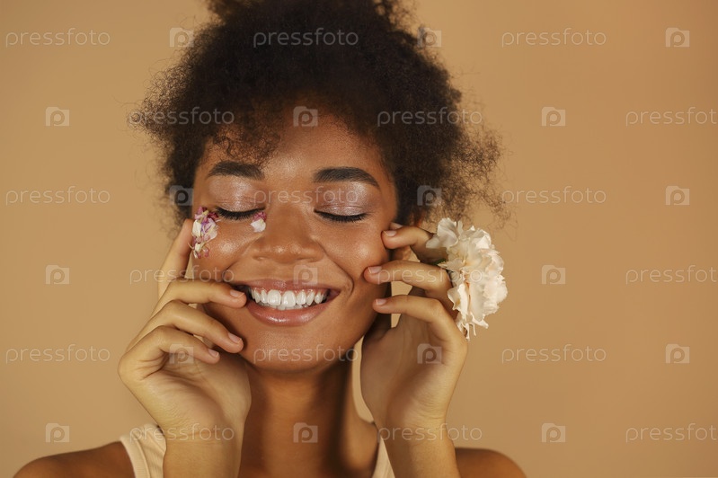 Красивая темнокожая модель с креативным макияжем, держащая розовый цветок гвоздики