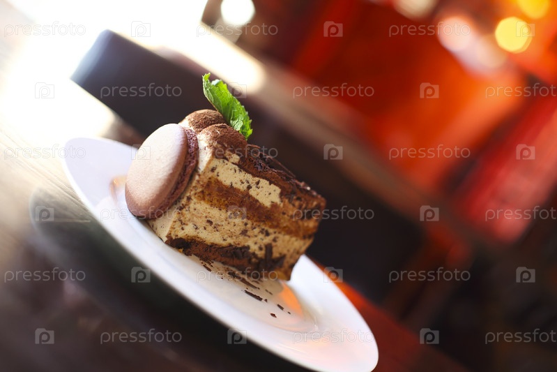 Кусок темного шоколадного торта, украшенный макаронами на белой тарелке