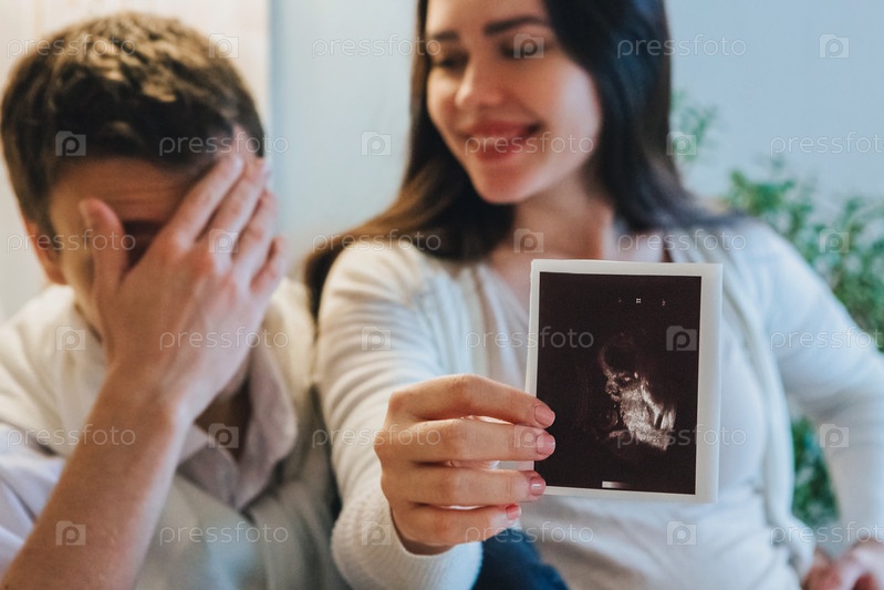 Молодая пара ждет ребенка. Счастливая беременная женщина показывает мужу УЗИ беременности