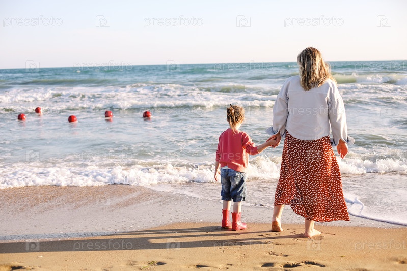 Молодая счастливая мать с улыбающейся дочерью, бегущей к ней на солнечном пляже