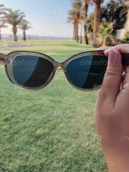 Женская рука держит в руке дизайнерские солнцезащитные очки, наслаждаясь летними каникулами на берегу моря