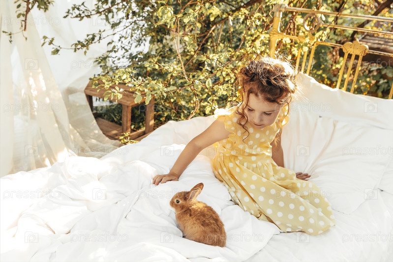 Маленькая красивая девочка в летнем платье сидит на улице с маленьким кроликом