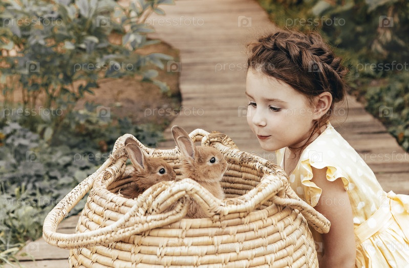 Маленькая красивая девочка в летнем платье сидит на деревянной дорожке перед соломенной корзиной с кроликами