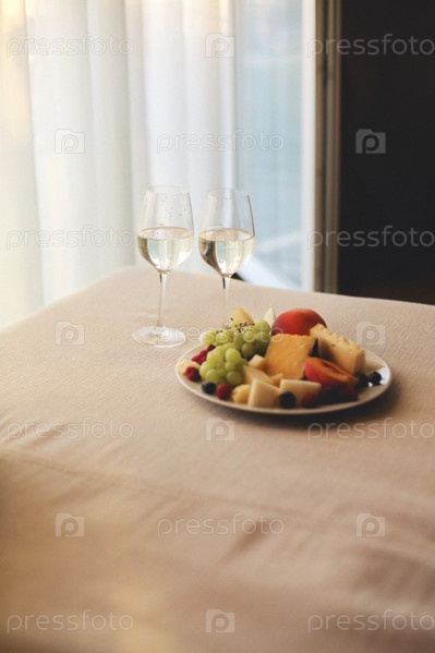 Серый диван с двумя бокалами белого вина и свежими фруктами на тарелке в помещении