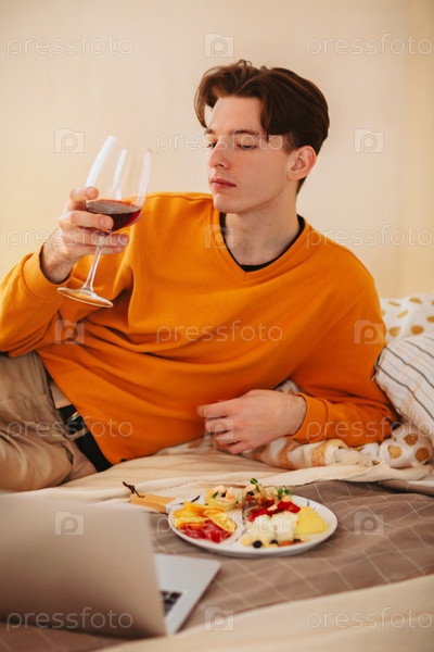 Расслабленный мальчик с бокалом вина смотрит видео на ноутбуке дома