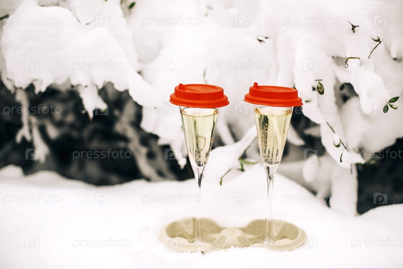 С Новым Годом. Два бокала шампанского с красными чашками